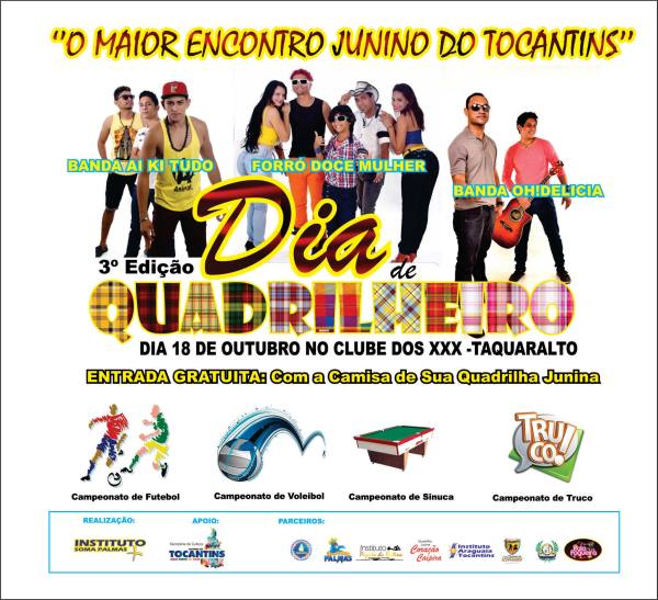 “Dia do Quadrilheiro” celebra união e alegria entre brincantes de todo o Tocantins Pelo terceiro ano consecutivo, o movimento junino do Tocantins realiza o tradicional Dia do Quadrilheiro, um evento dedicado à confraternização e valorização de todos os envolvidos na cadeia produtiva das quadrilhas juninas. A edição de 2015 acontece no dia 18 de outubro,... Continuar Lendo →